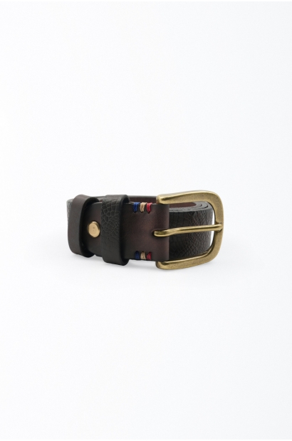 Cinturón de piel marrón oscuro con textura grabada y detalle tricolor