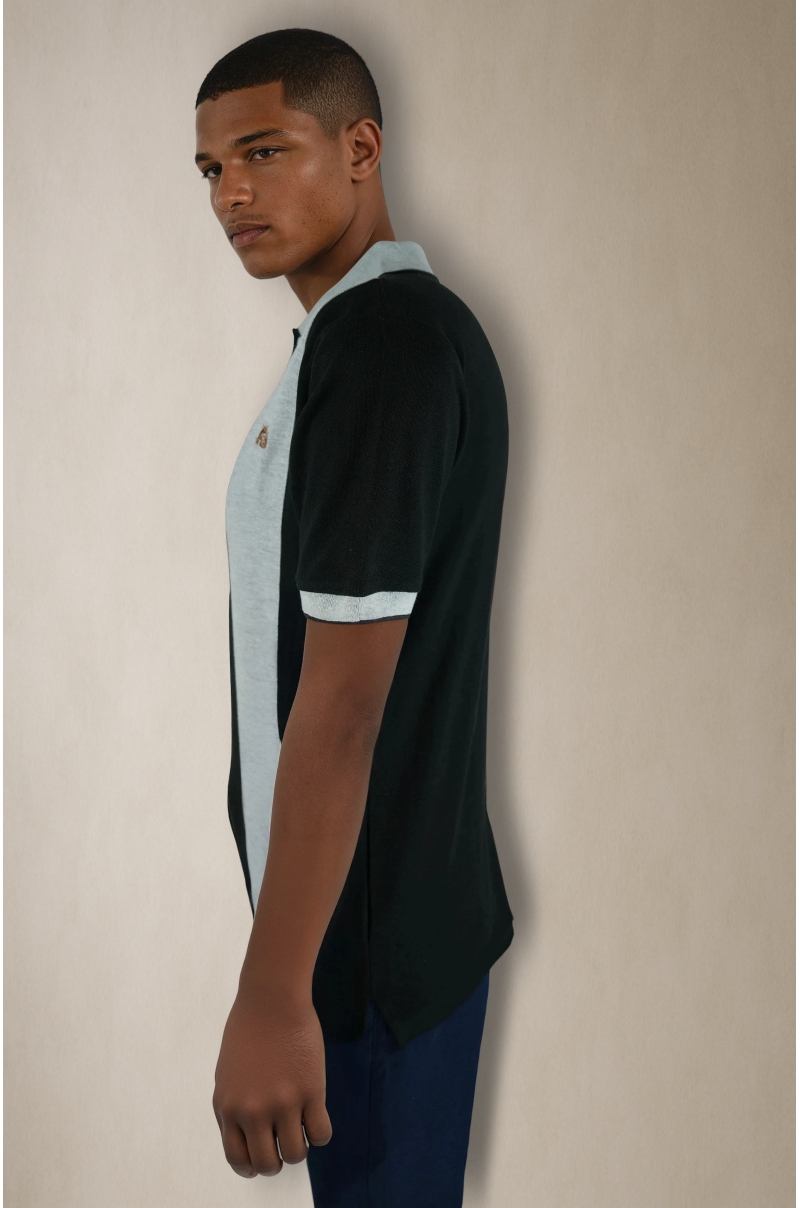 Polo prenda para diferentes ocasiones, banda gris vertical con logo caballo bordado en el pecho, confeccionado 100% algodón, corte en los laterales de la cintura, tapete 2 botones, botones grabado de la marca.