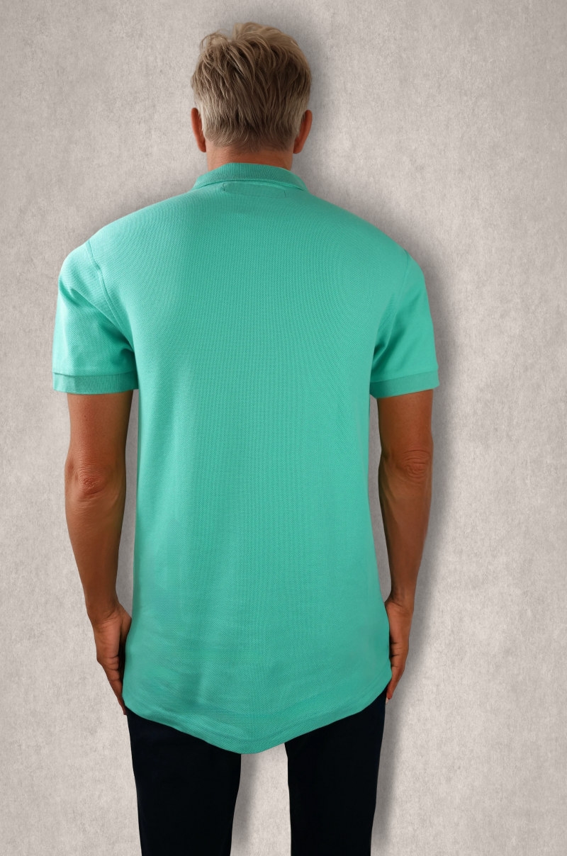 Polo de hombre Old Rowley confeccionado en doble piqué de algodón 100% , suave, transpirable y muy resistente. Color turquesa luminoso, cuello camisero clásico con tapeta de tres botones y logo del caballo bordado en el pecho. Corte regular para un ajuste cómodo y versátil en looks casual o smart-casual.