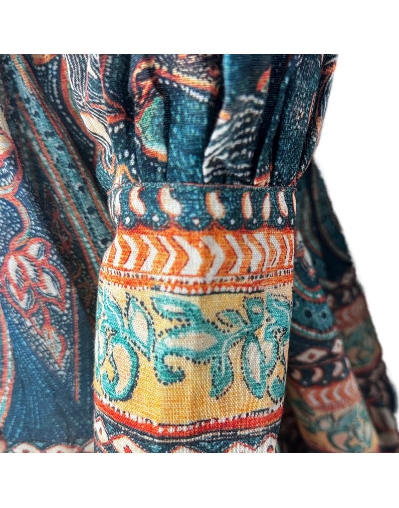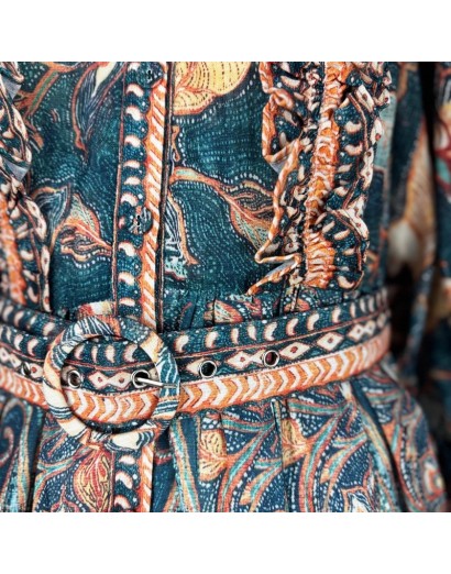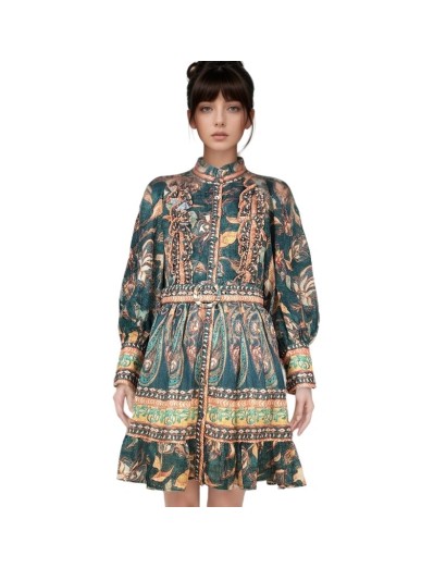 Vestido corto con estampado vintage, mangas largas abullonadas y cinturón ajustable, confeccionado en algodón para mayor comodidad y estilo.
