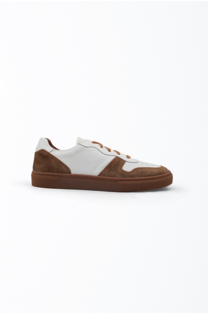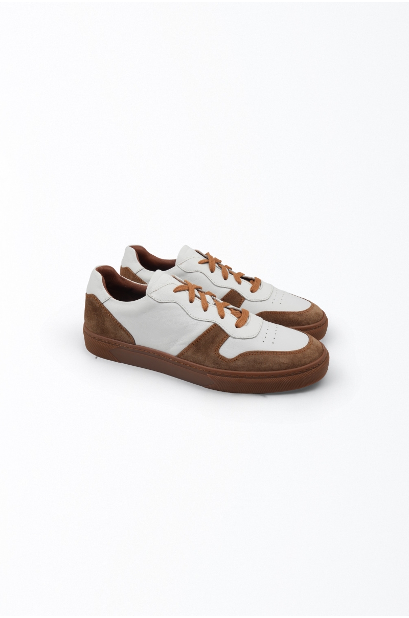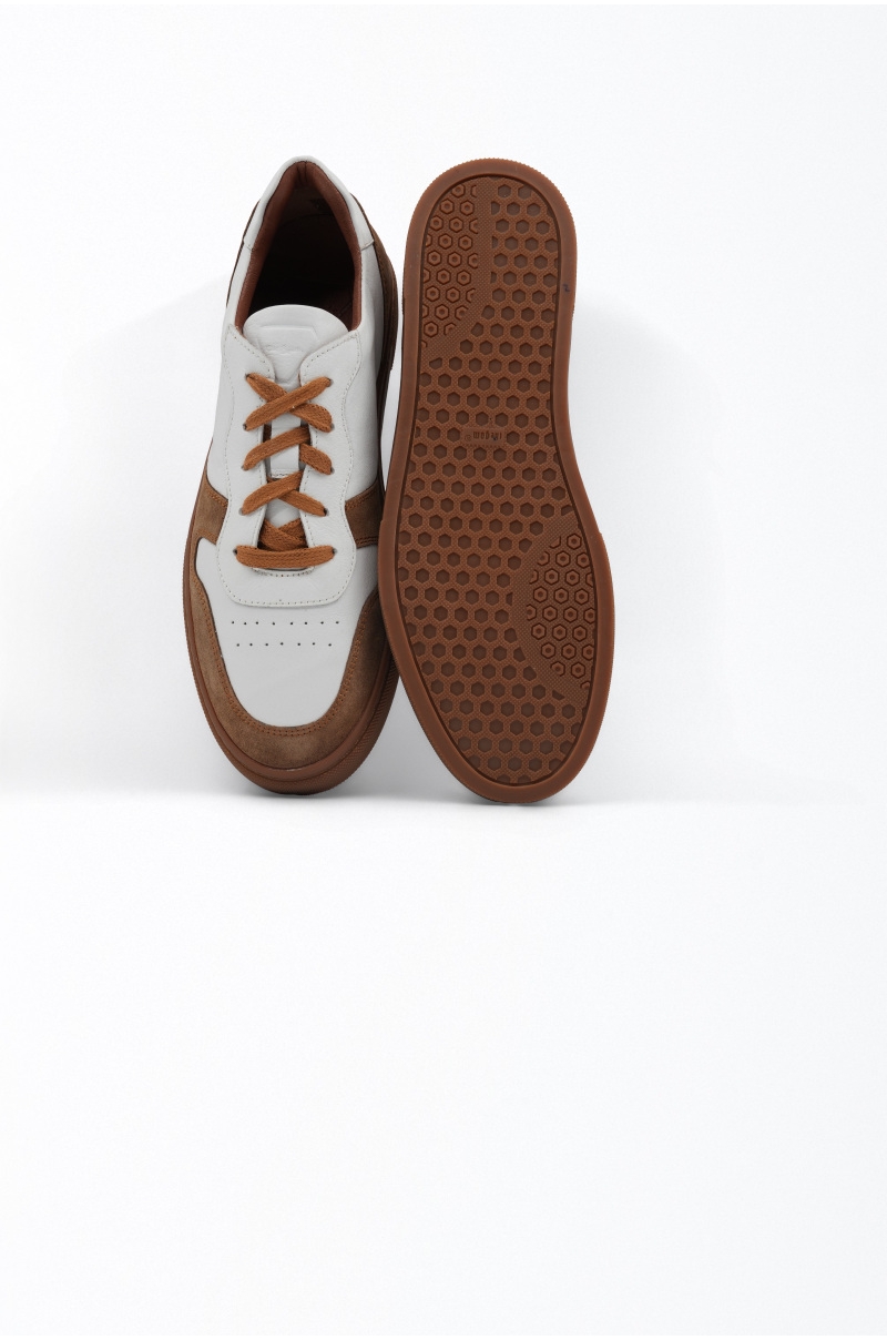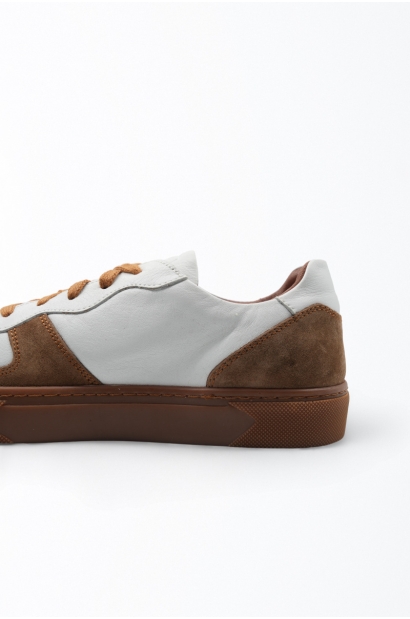 Baskets en cuir blanc et daim marron Old Rowley, avec semelle en caoutchouc marron et fermeture à lacets. Elles allient confort, élégance et polyvalence pour un usage urbain au quotidien.